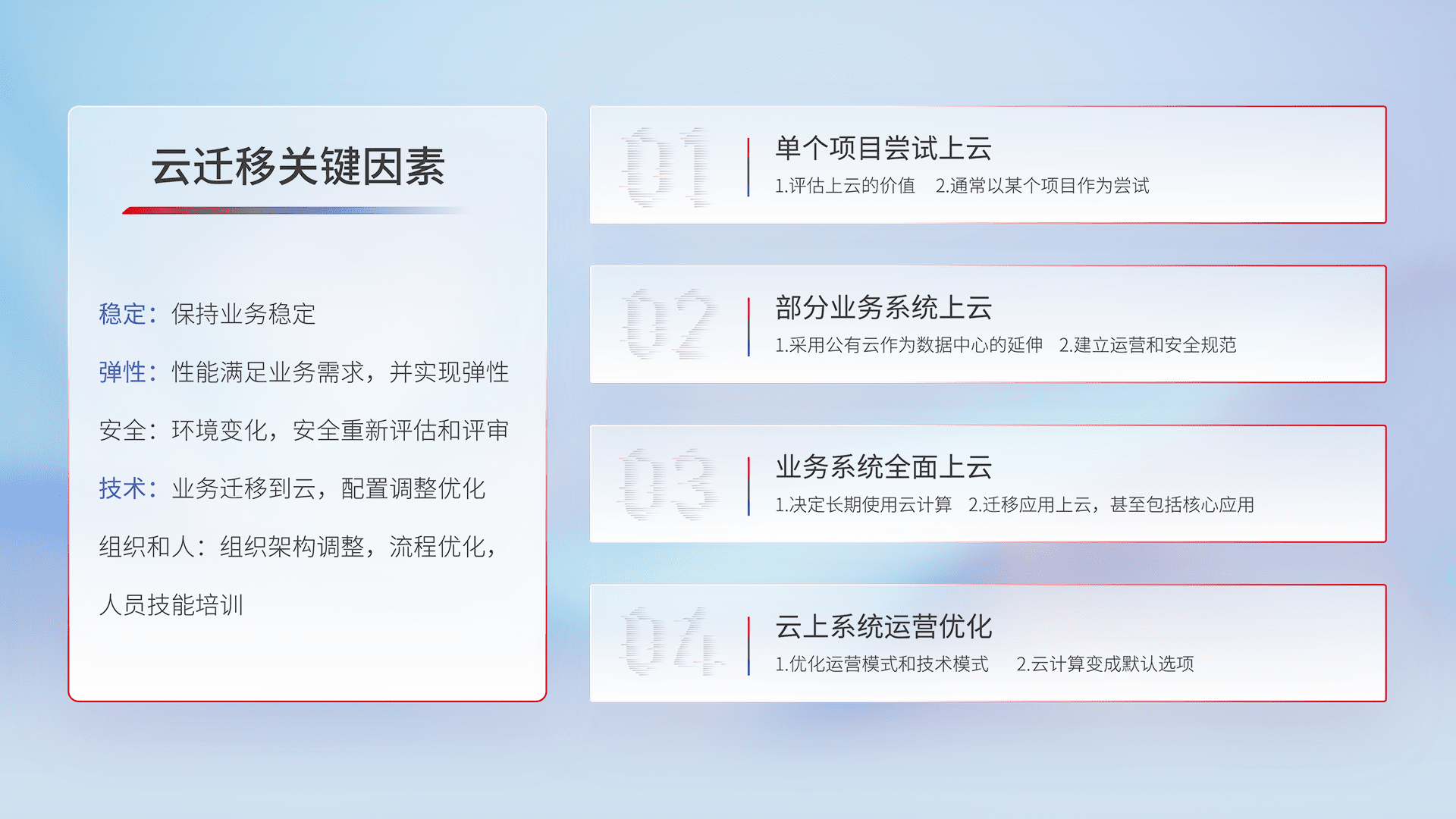结合实际业务,,从规划设计、、云平台选型、、、云原生改造、、、数据迁移、、、、集成交付,,,迁移全过程为客户识别最佳上云路径,,做好风险识别管理,,设计网络架构、、身份权限、、、安全审计合规、、操作审计、、日志审计、、监控告警策略、、、多站点容灾设计等,,,,对云上基础设施进行整体规划,,,提升IT治理水平,,,,以满足弹性、、高可用、、高性能的需求。。
