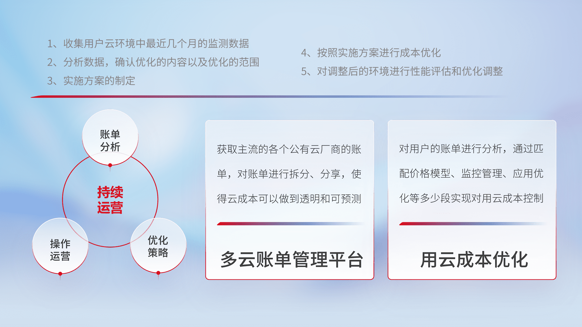 通过多云纳管,,,,以统一的资源数据模型把客户的云资源进行抽象和封装,,,,进而实现对多云资源的统一操作,,保障云资源管理的可靠性、、、、稳定性与可用性。。。量身定制化运维内容,,配置、、、、开发运维、、、补丁管理、、、、备份、、监控、、认证和访问管理、、、、审计和日常巡检等,,,,保障在用云过程中的可靠度,,,稳定度以及高可用率。。。。